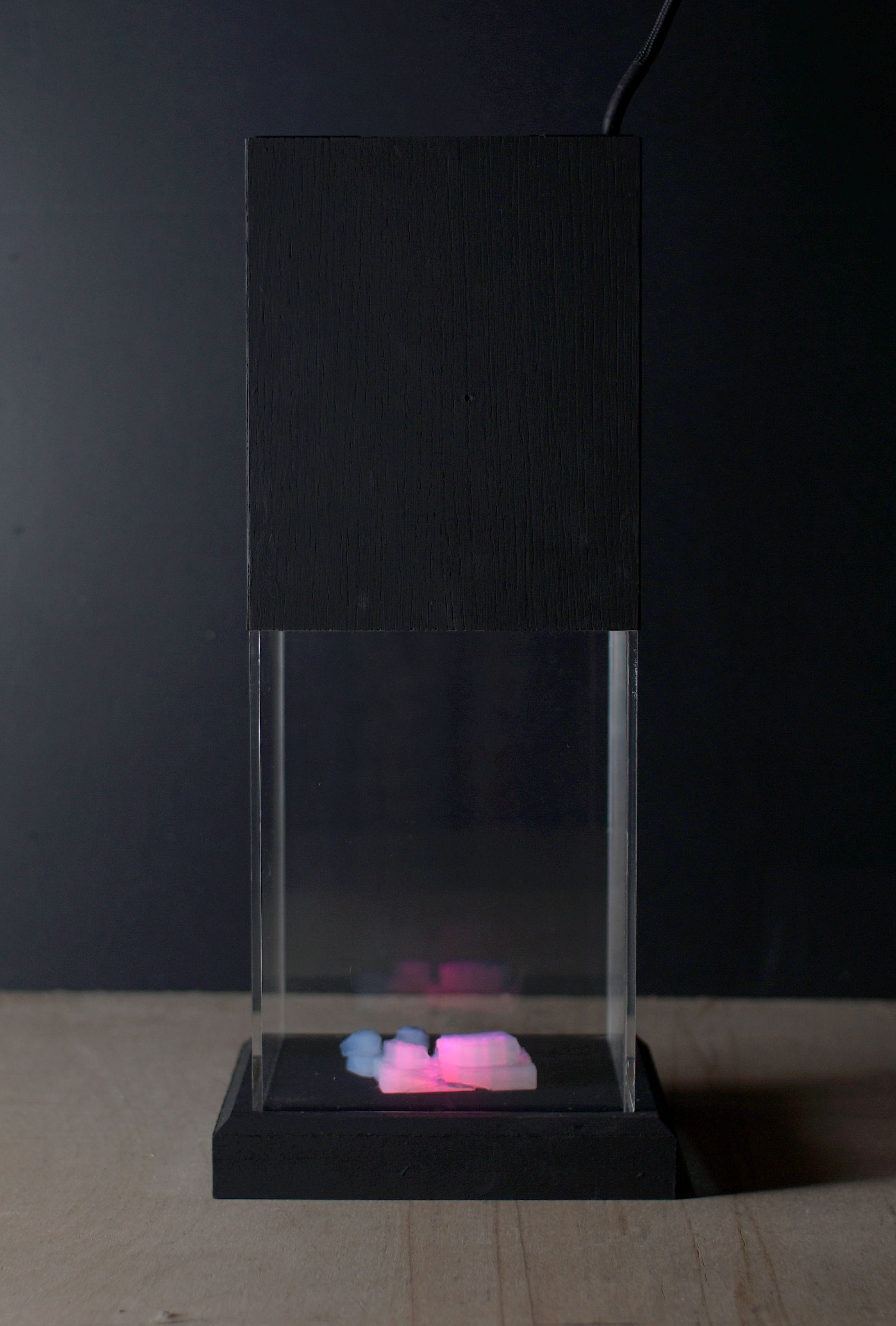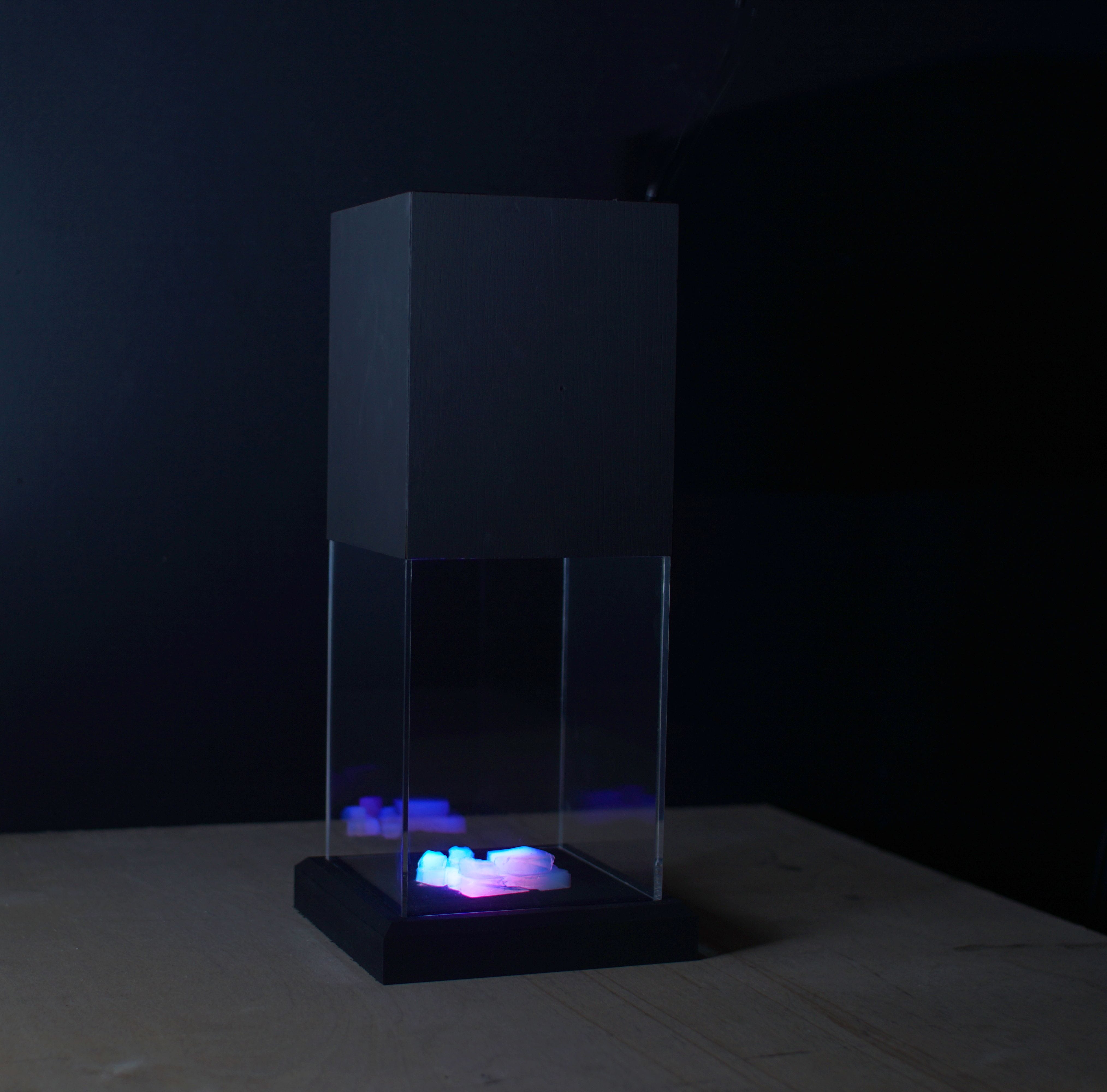Aurora Imaginaris is, or represents, a fictional material emergent from digital media and nanotech physical processes. It is fake, imagined, not what it seems, yet beguiling and beautiful. It embodies both media and physical material, but as a hybrid substance does it even exist at all?