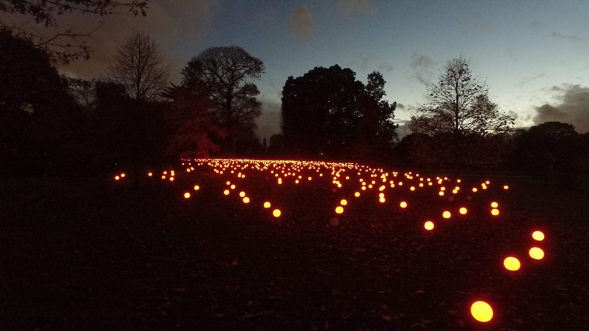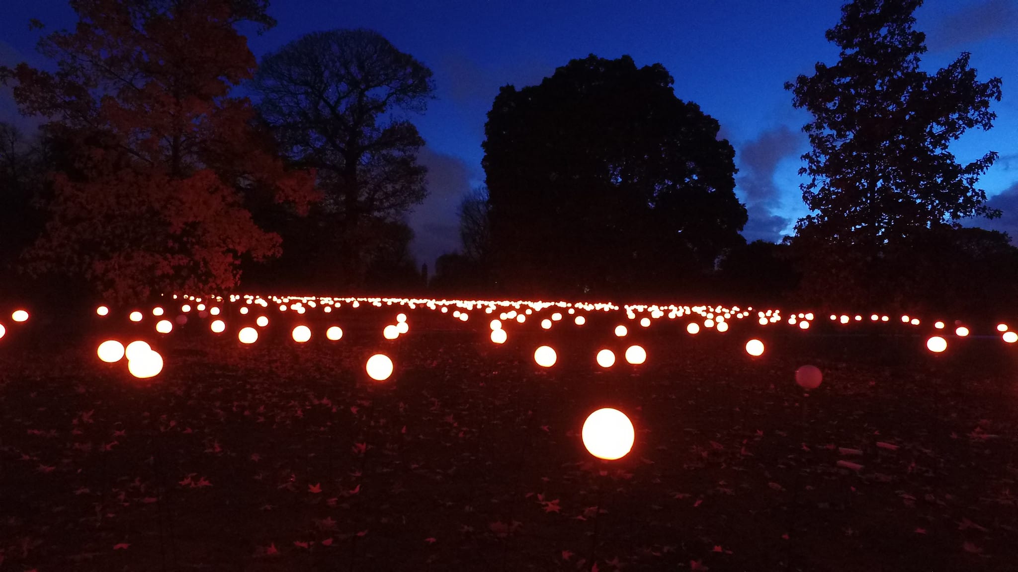 A thousand spheres of light, each on a stalk and bobbing gently in the wind, fill a large clearing. The lights visualise waves of energy flowing across the space; acting in synchronicity, creating changes in ambience, choreographed patterns of light enveloping the space. The Garden comes alive in a bloom of energy and sound, acknowledging the depths of winter yet anticipating a still distant spring.
