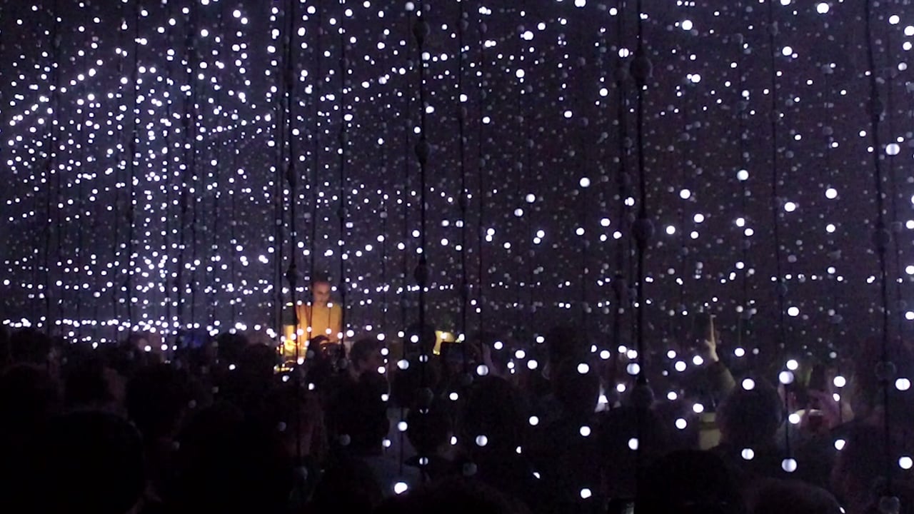 The work consisted of a 30m x 30m volume of lights, over 40,000 individually addressable points of light in total. Inside, the space was  a combination of intense, immersive, dynamic light space and live performance – with Four Tet at the centre of an experience that broke down boundaries between performer and audience, installation and performance, the physical and the digital. Performer and 10,000 audience members were surrounded by, and immersed within, a volumetric, spatialised sound and light experience.