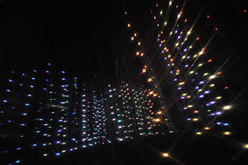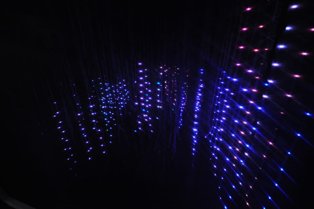 The work is part of the Ocean of Light project – an ongoing series of explorations into the creative and immersive possibilities of light-based real-time visualisation in physical space. At the heart of the project is a room-sized 3D grid of individually addressable points of light that is controllable in real time to simulate objects and movement in physical space. This bespoke hardware enables the creation of dynamic, interactive, three-dimensional sculptures from light. The resulting imagery has a presence, a location in physical space that allows the viewer to move around and experience the work from any angle.