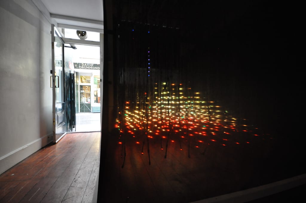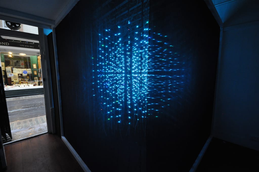 Scapes was commissioned by Tenderpixel Gallery (London) and premiered in January 2011 at the Central London gallery. Tuned software and specifically designed sounds are used to generate a series of abstract landscapes visualised on a bespoke room-sized 3D grid of lights controlled in real time. As the sounds are played through speakers and picked up with microphones, the visual process can be interacted with – intercepted, corrupted and altered by visitors making their own sounds to interfere with the original audiovisual designs.